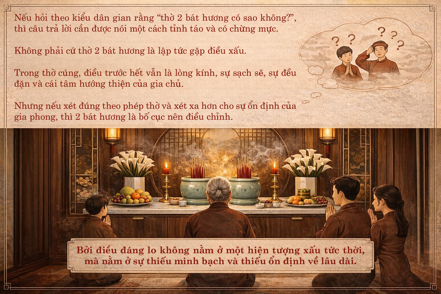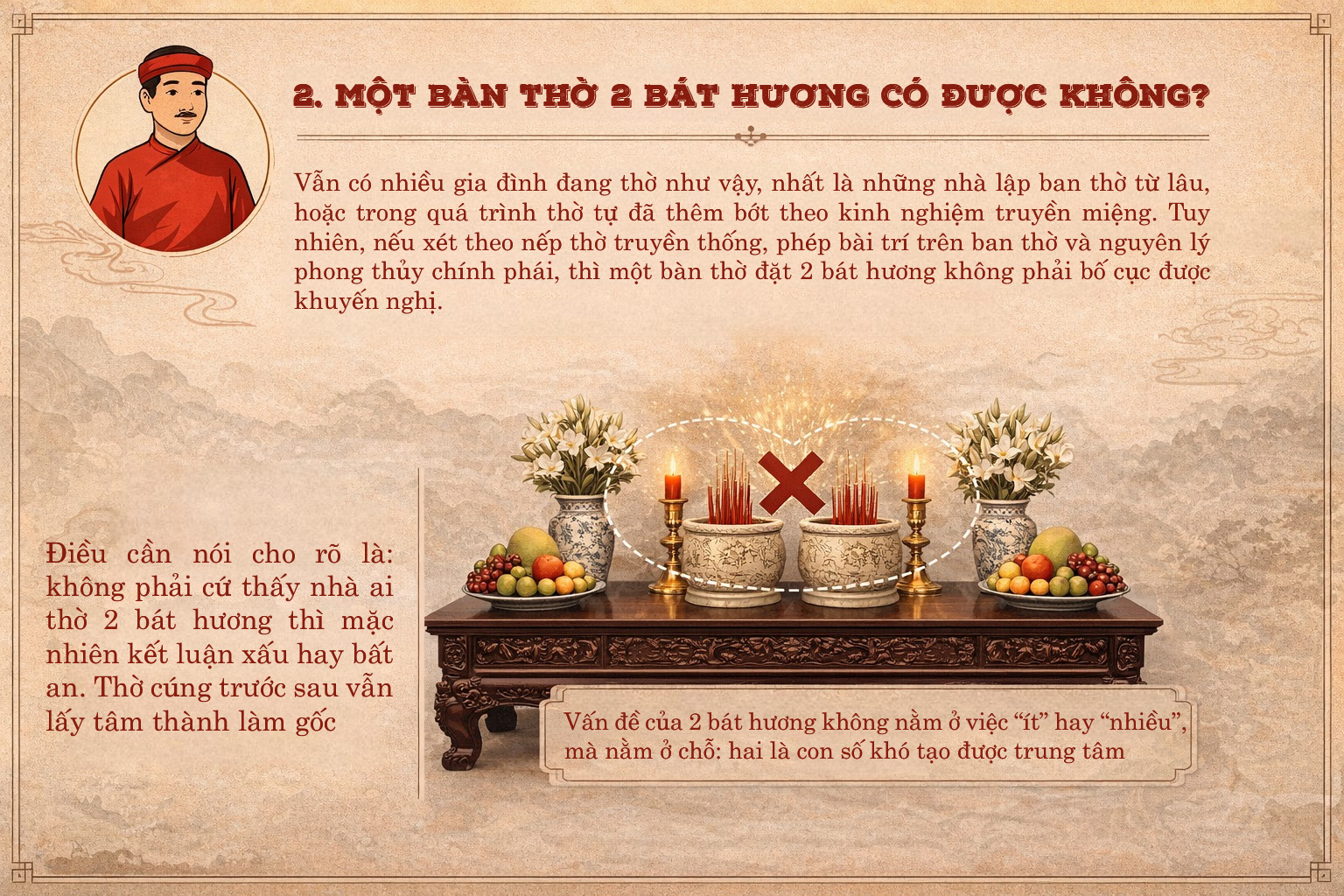 Điều cần nói cho rõ là: không phải cứ thấy nhà ai thờ 2 bát hương thì mặc nhiên kết luận xấu hay bất an. Thờ cúng trước sau vẫn lấy tâm thành làm gốc. Nhưng tâm thành là một chuyện, còn cách lập vị trí thờ tự cho đúng phép lại là chuyện khác. Cũng như một món đồ thờ có thể rất đẹp, rất quý, nhưng nếu đặt sai vai, sai chỗ, sai ngôi thì vẻ trang nghiêm của cả ban thờ vẫn bị khuyết đi một phần.