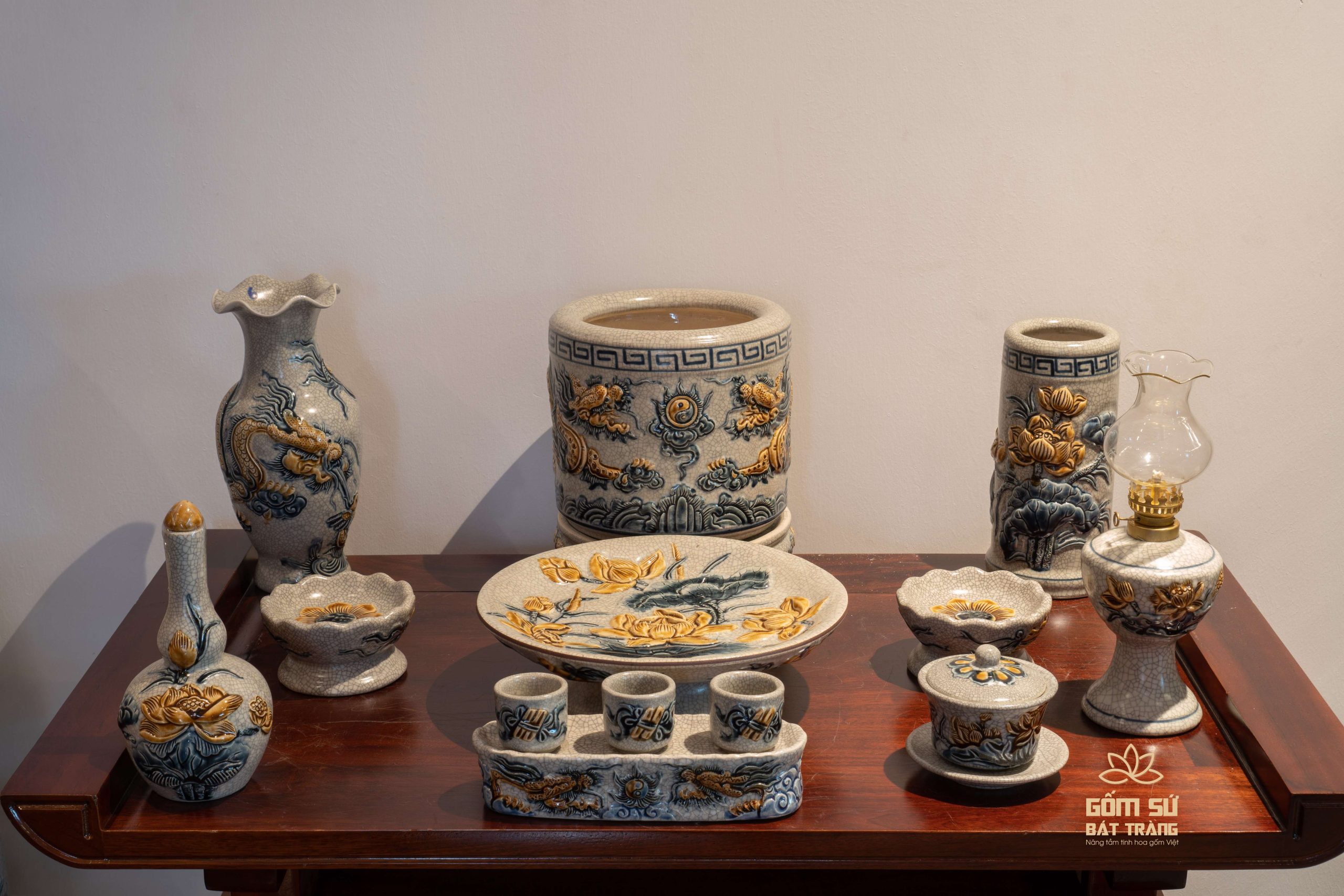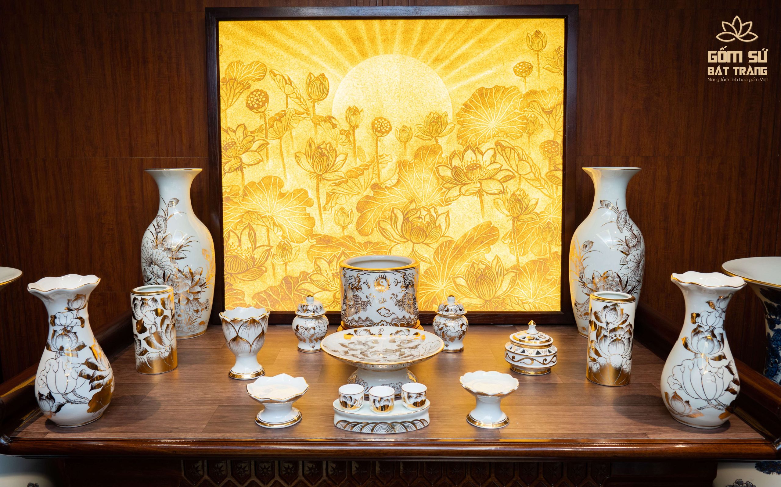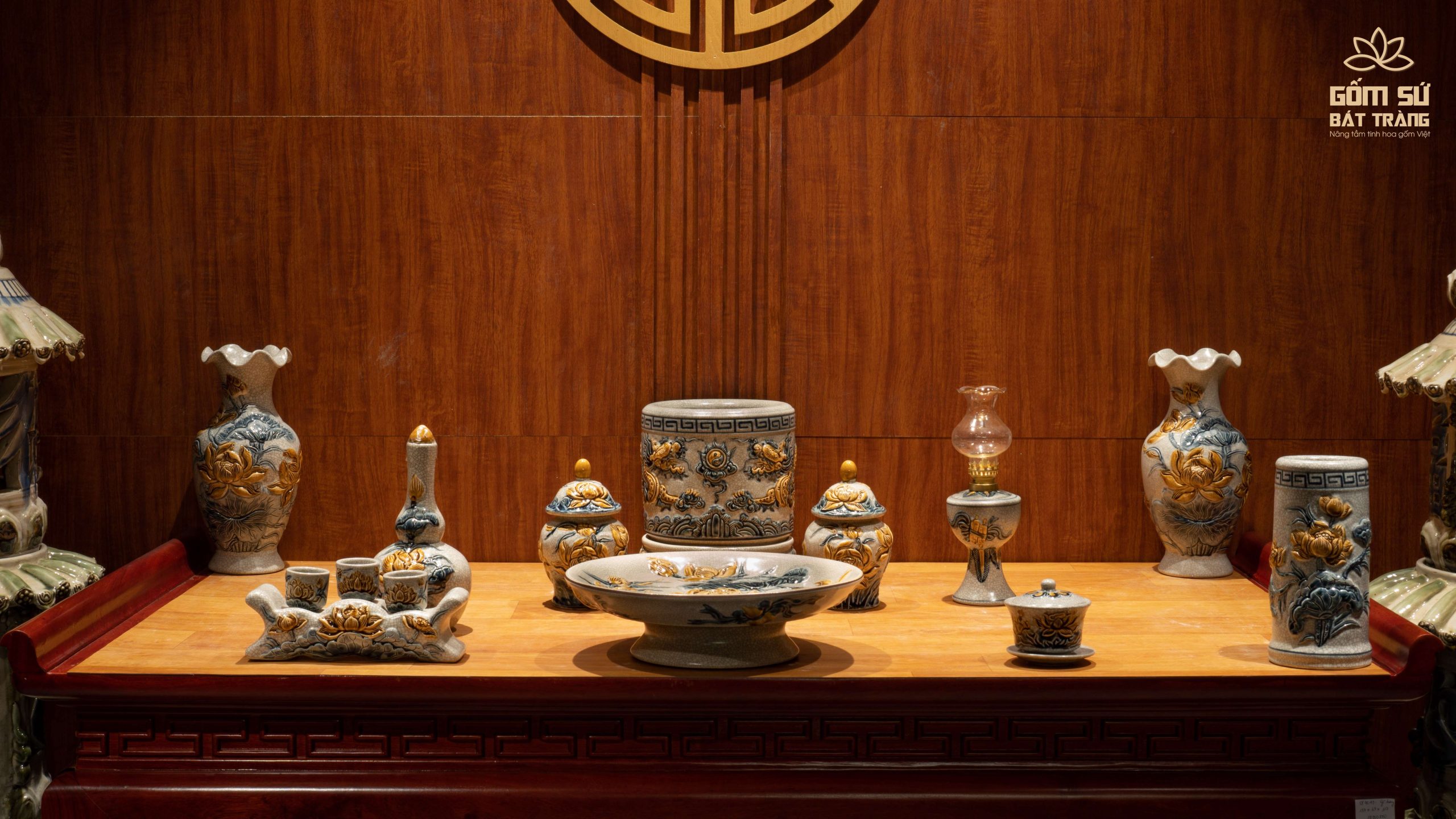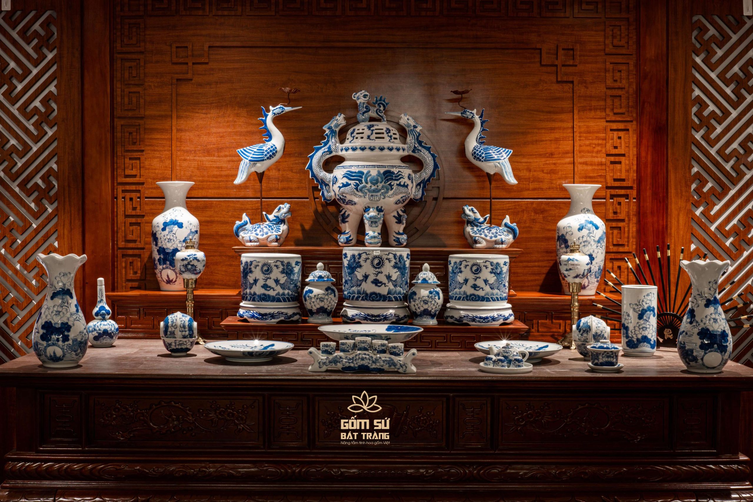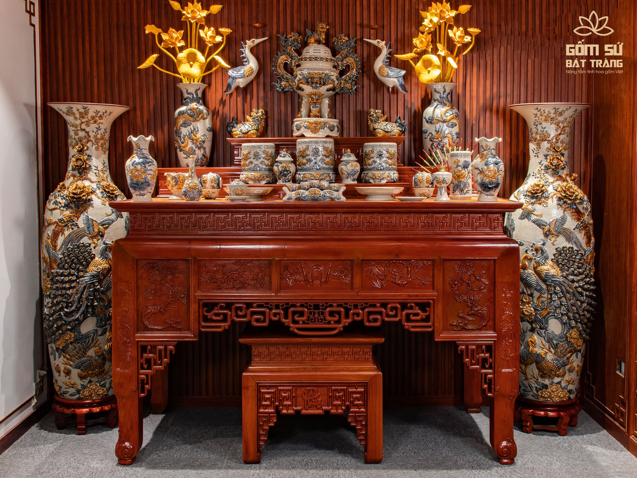 Gốm Sứ Bát Tràng trưng bày hàng ngàn tuyệt tác tinh hoa, từ đồ thờ, lộc bình, bình hút lộc cho đến gốm gia dụng… đầy đủ các dòng men (men rạn, men lam, vẽ vàng, men hỏa biến…) – Sản phẩm cao cấp, thủ công 100%, chế tác theo quy trình 22 bước nghiêm ngặt, chuẩn làng nghề.
