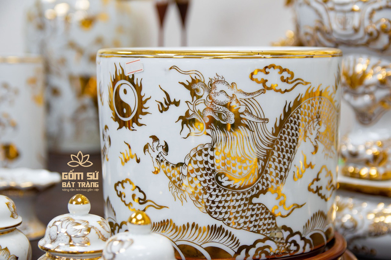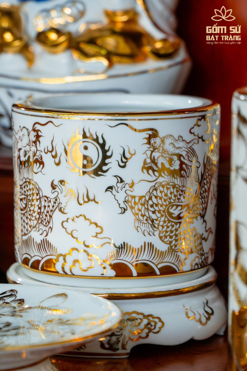 Bát hương Lưỡng Long Chầu Nguyệt Vẽ Vàng Nền Trắng – Khi linh khí đất trời hội tụ