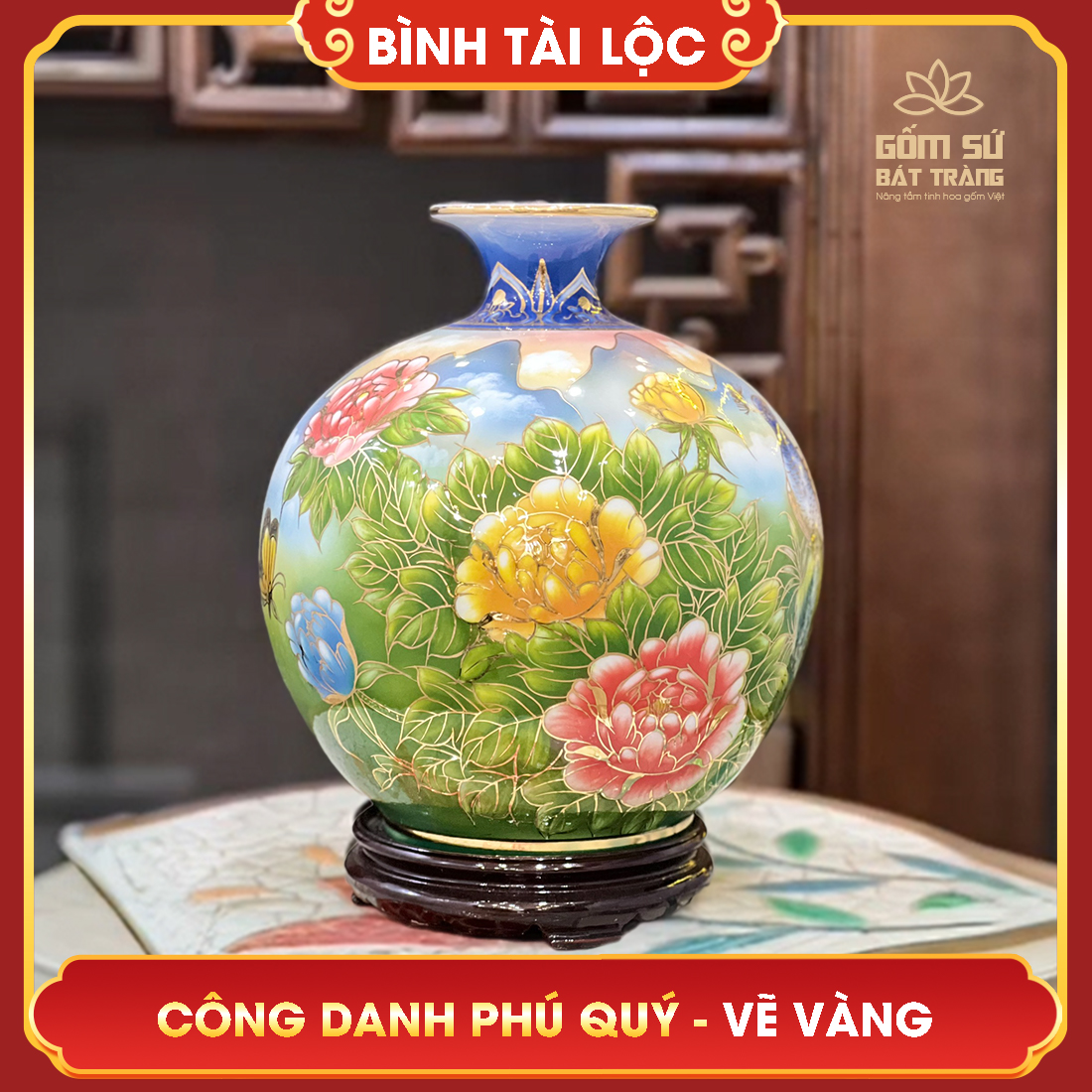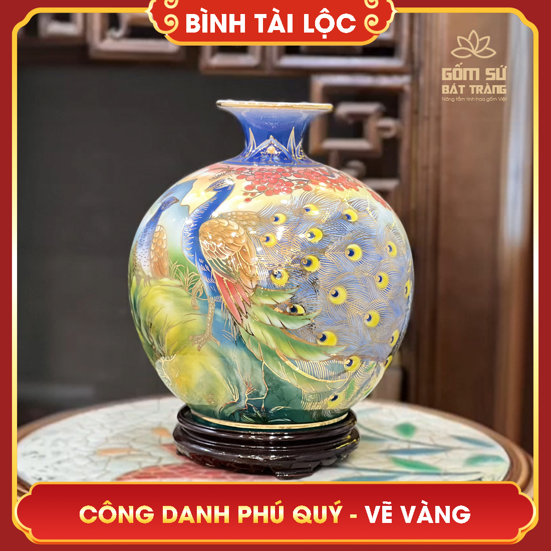 - Trong hộp có: Bình tài lộc vẽ vàng Công Danh Phú Quý H30, đế gỗ cao cấp