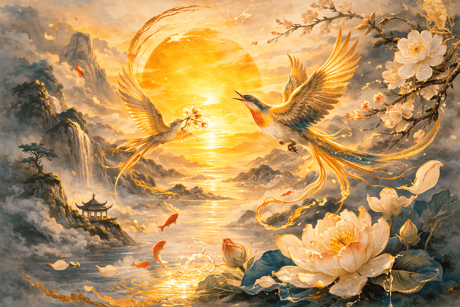 Hạnh phúc song hành: Sự xuất hiện của đôi chim đang bay lượn quấn quýt còn mang ý nghĩa về sự gắn kết bền chặt, đồng lòng giữa vợ chồng (Phu thê viên mãn). Đây là lời chúc cho gia đạo luôn êm ấm, thuận hòa – cái gốc rễ bền vững để mọi sự nghiệp đều thăng hoa.