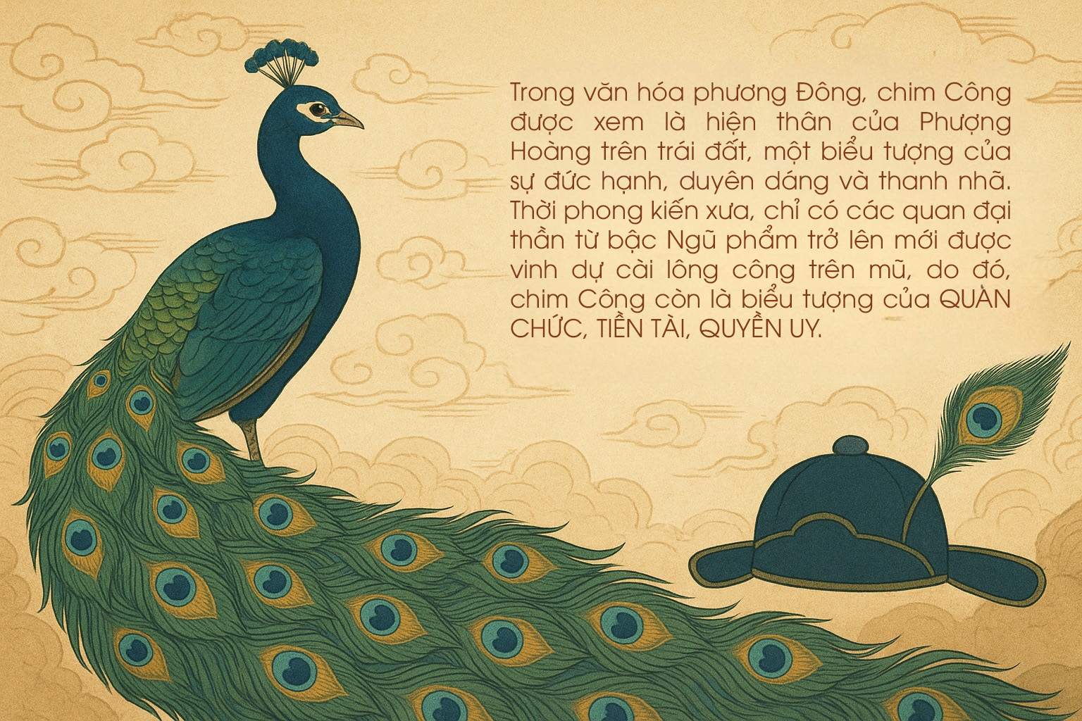 Trong văn hóa phương Đông, chim Công được xem là hiện thân của Phượng Hoàng trên trái đất, một biểu tượng của sự đức hạnh, duyên dáng và thanh nhã. Thời phong kiến xưa, chỉ có các quan đại thần từ bậc Ngũ phẩm trở lên mới được vinh dự cài lông công trên mũ, do đó, chim Công còn là biểu tượng của QUAN CHỨC, TIỀN TÀI, QUYỀN UY.