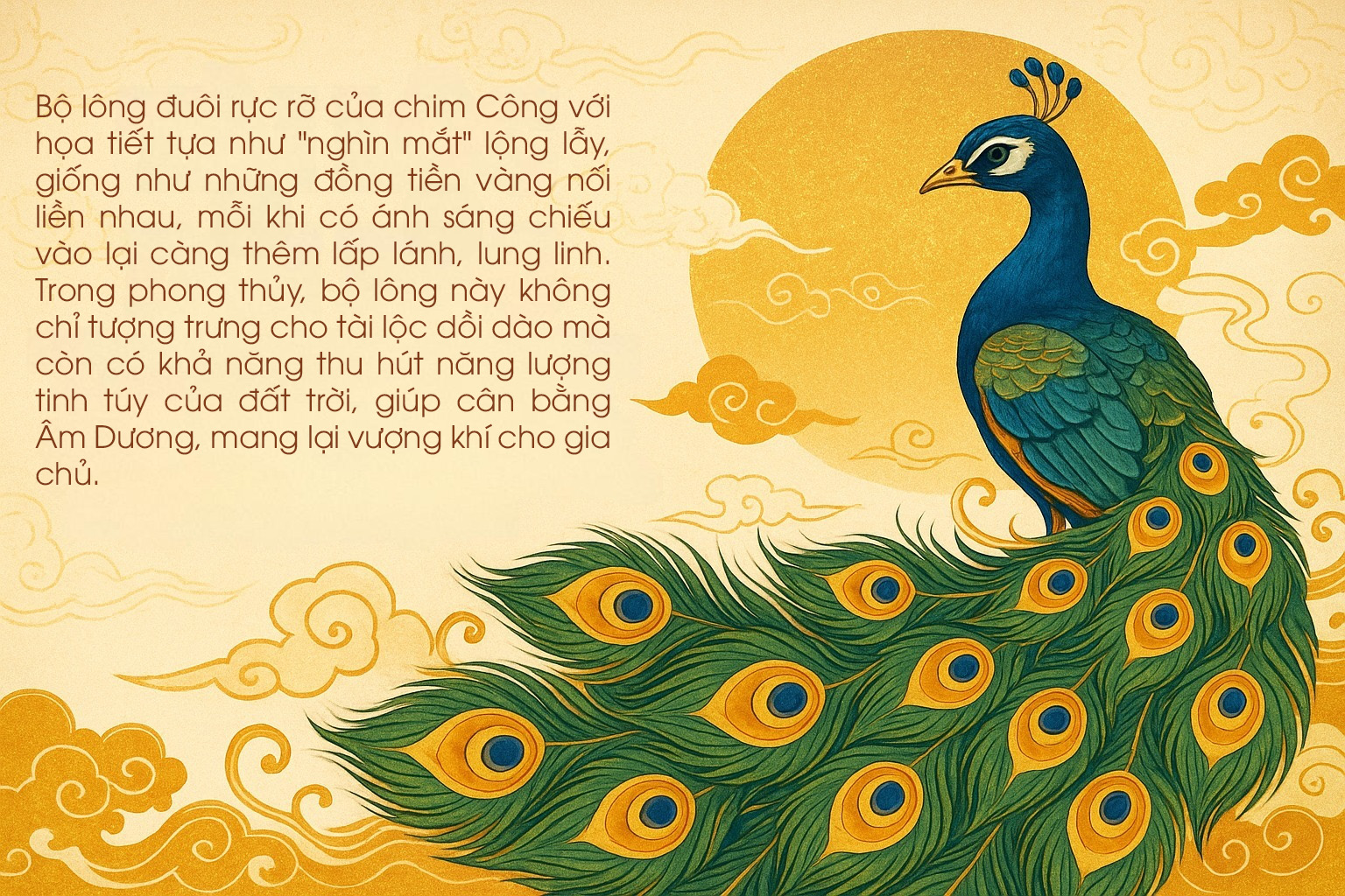 Bộ lông đuôi rực rỡ của chim Công với họa tiết tựa như “nghìn mắt” lộng lẫy, giống như những đồng tiền vàng nối liền nhau, mỗi khi có ánh sáng chiếu vào lại càng thêm lấp lánh, lung linh. Trong phong thủy, bộ lông này không chỉ tượng trưng cho tài lộc dồi dào mà còn có khả năng thu hút năng lượng tinh túy của đất trời, giúp cân bằng Âm Dương, mang lại vượng khí cho gia chủ.