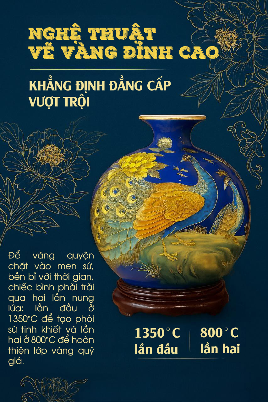 Vẻ đẹp và ý nghĩa của họa tiết “Phú Quý Mãn Đường” càng trở nên rực rỡ và sang trọng hơn nhờ kỹ thuật vẽ vàng 24.. Những chi tiết đắt giá nhất của đôi chim công và hoa mẫu đơn được các nghệ nhân Gốm Sứ Bát Tràng tỉ mỉ điểm xuyết bằng vàng lỏng, tạo nên sự lấp lánh, quyền quý và tăng thêm giá trị cho vật phẩm. Để vàng quyện chặt vào men sứ, bền bỉ với thời gian, chiếc bình phải trải qua hai lần nung lửa: lần đầu ở 1350°C để tạo phôi sứ tinh khiết và lần hai ở 800°C để hoàn thiện lớp vàng quý giá.