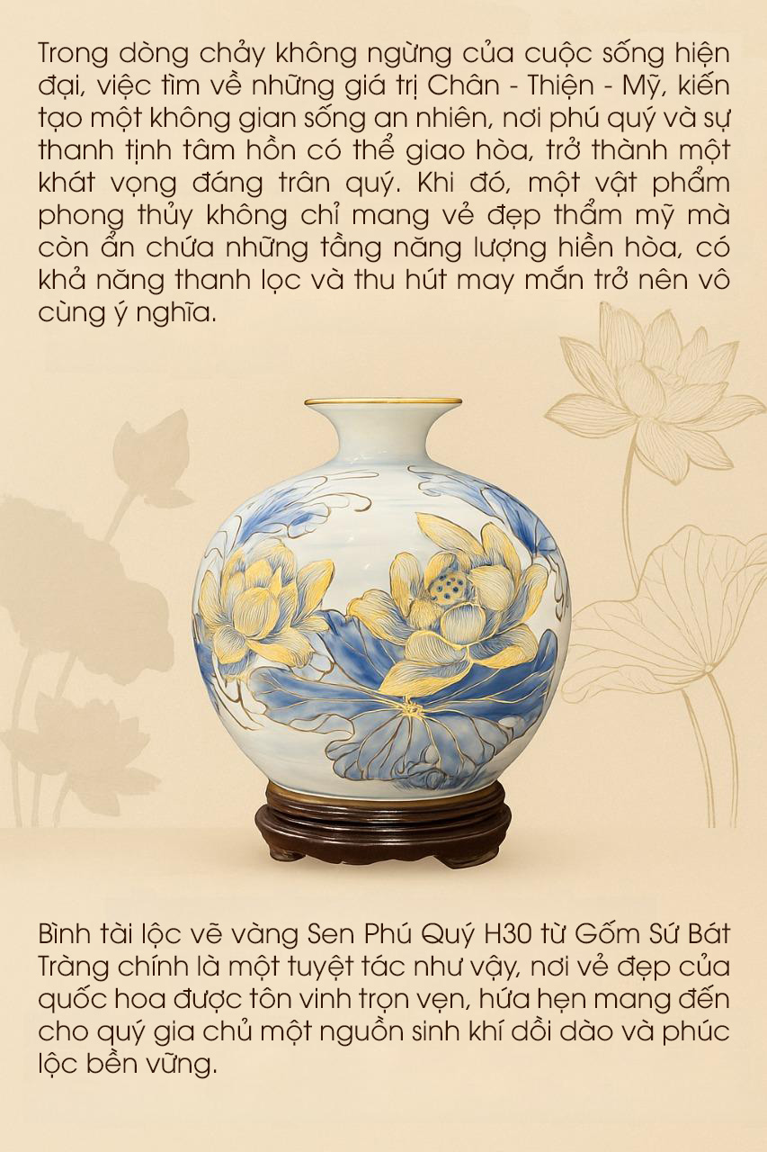 Với chiều cao 30cm, Bình tài lộc vẽ vàng “Sen Phú Quý” H30 là lựa chọn lý tưởng để bài trí tại phòng khách, thư phòng, phòng làm việc, mang đến vẻ đẹp thanh tao và nguồn năng lượng cát tường. Đây cũng là món “Quà từ tâm, xứng tầm gia chủ”, gửi gắm lời chúc phúc về một cuộc sống đủ đầy, phú quý song hành cùng sự thanh tịnh và an lạc trong tâm hồn.