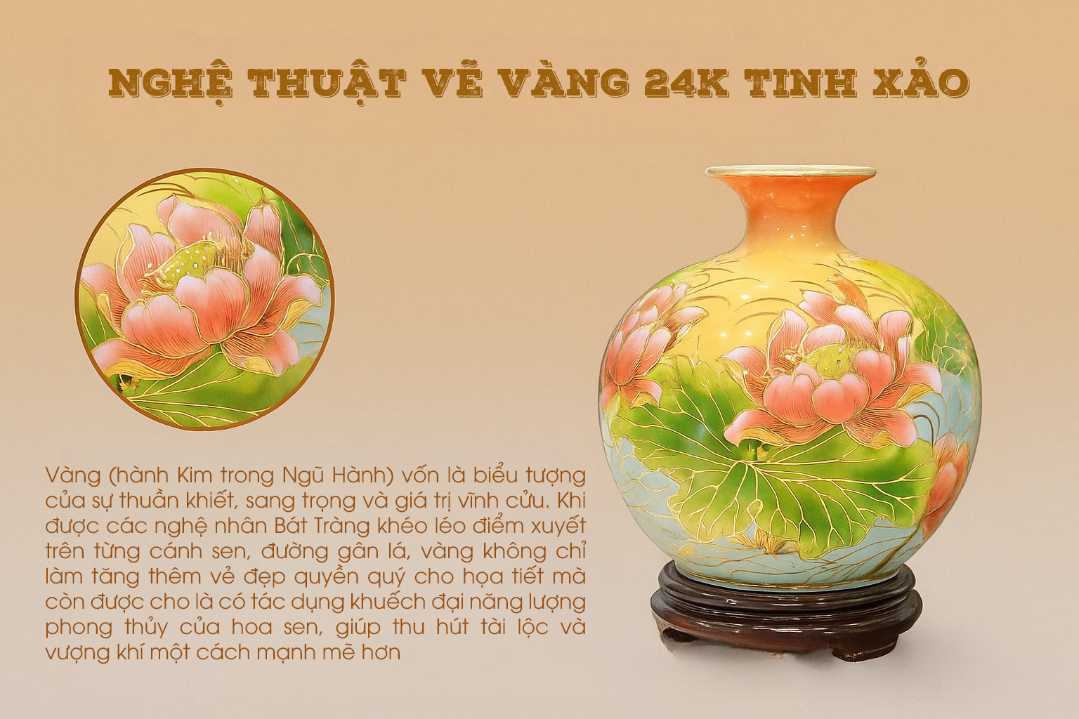 Trước khi đi sâu vào ý nghĩa họa tiết, không thể không nhắc đến nghệ thuật vẽ vàng 24K tinh tế bao phủ lấy những đóa sen. Vàng (hành Kim trong Ngũ Hành) vốn là biểu tượng của sự thuần khiết, sang trọng và giá trị vĩnh cửu. Khi được các nghệ nhân Bát Tràng khéo léo điểm xuyết trên từng cánh sen, đường gân lá, vàng không chỉ làm tăng thêm vẻ đẹp quyền quý cho họa tiết mà còn được cho là có tác dụng khuếch đại năng lượng phong thủy của hoa sen, giúp thu hút tài lộc và vượng khí một cách mạnh mẽ hơn. Quá trình này đòi hỏi sự tỉ mỉ và hai lần nung lửa công phu (lần 1 ở 1350°C tạo cốt sứ, lần 2 ở 800°C để vàng quyện chặt vào men ), tạo nên một tuyệt tác bền đẹp với thời gian.