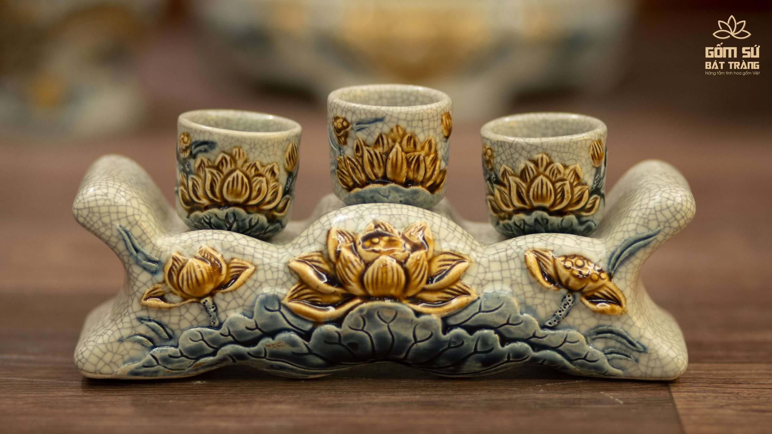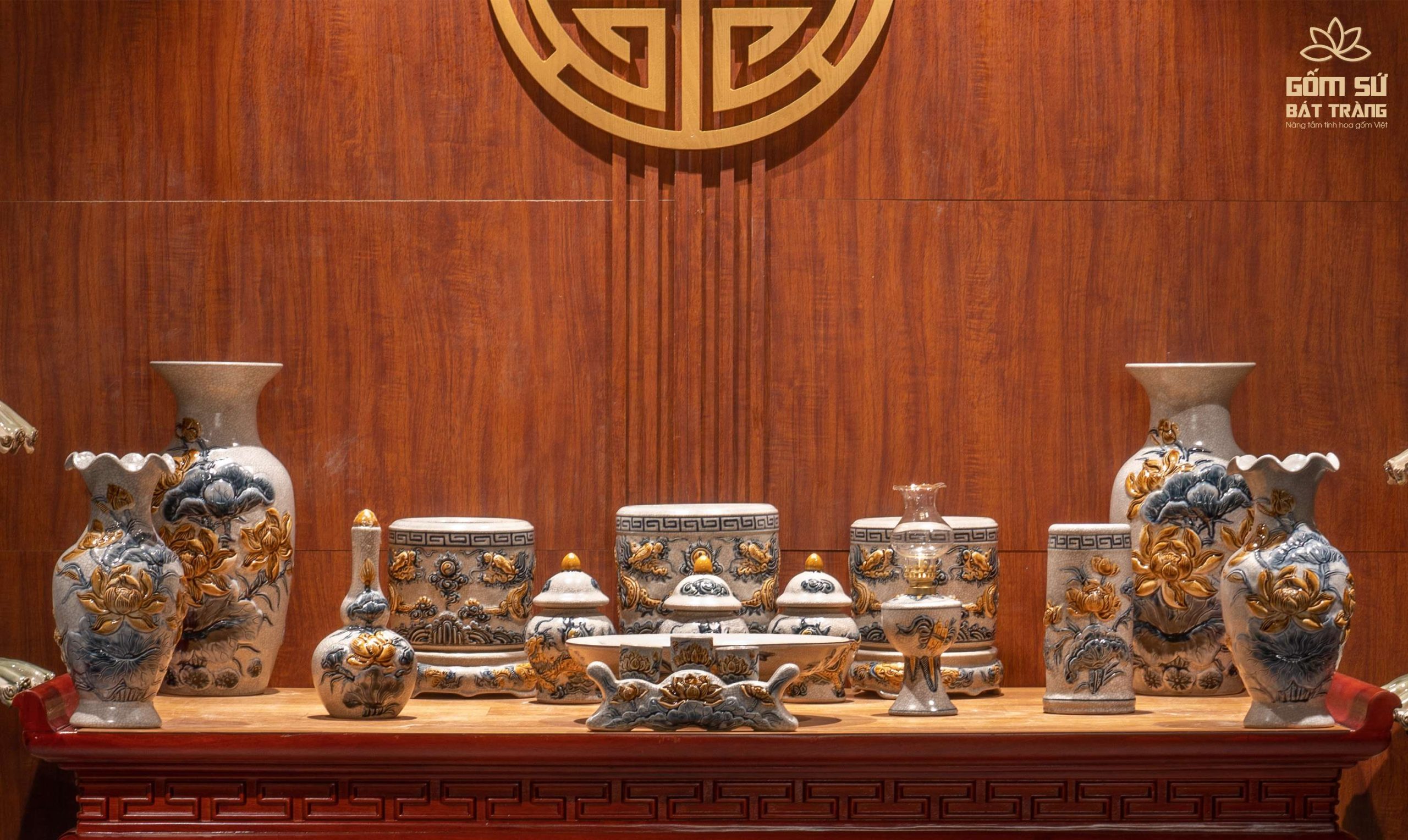 Với chất men rạn cổ đặc trưng của làng nghề Bát Tràng, bộ sản phẩm là sự lựa chọn hoàn hảo cho những ban thờ cỡ lớn, khẳng định vị thế và lòng thành kính của gia chủ.