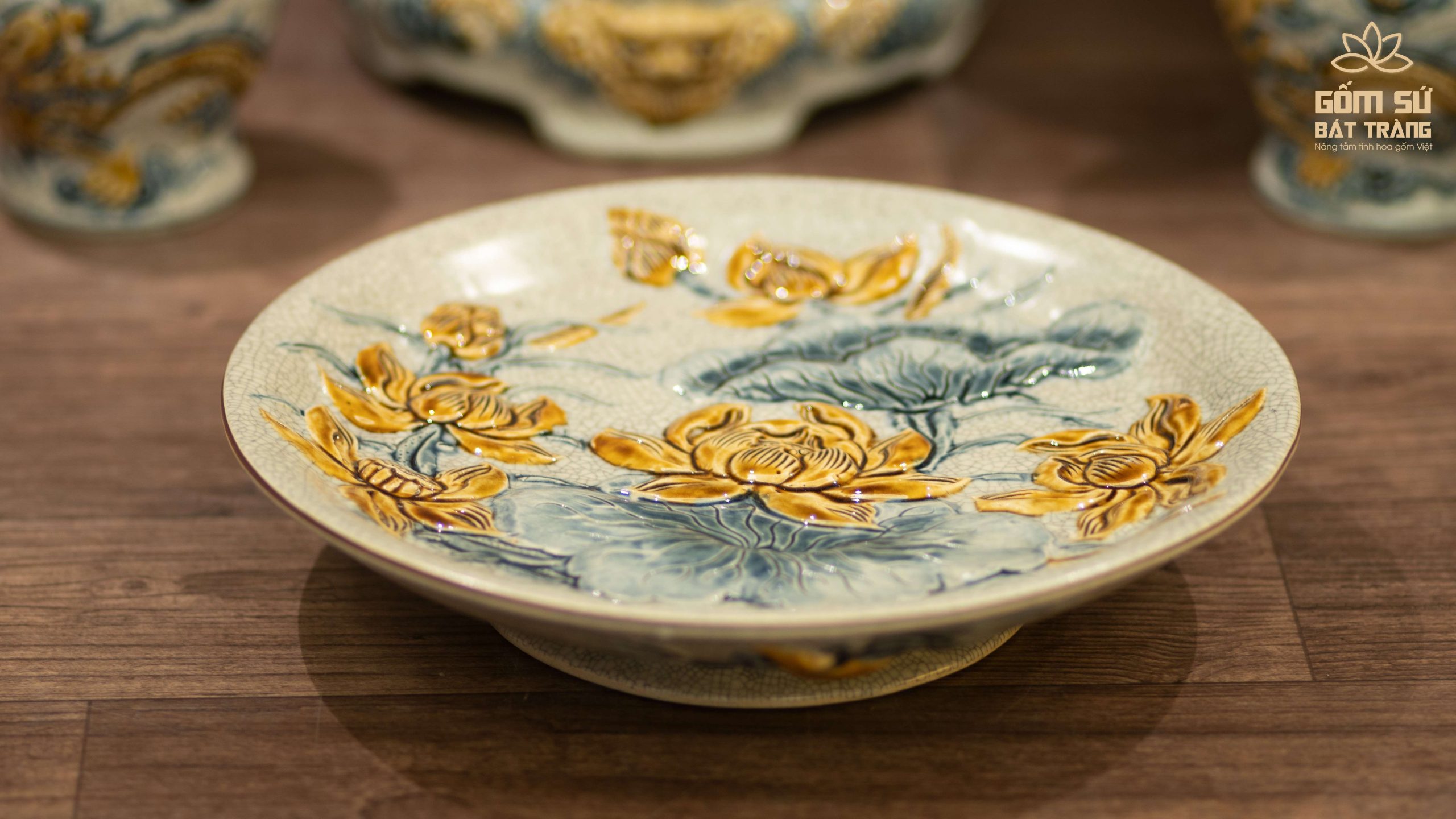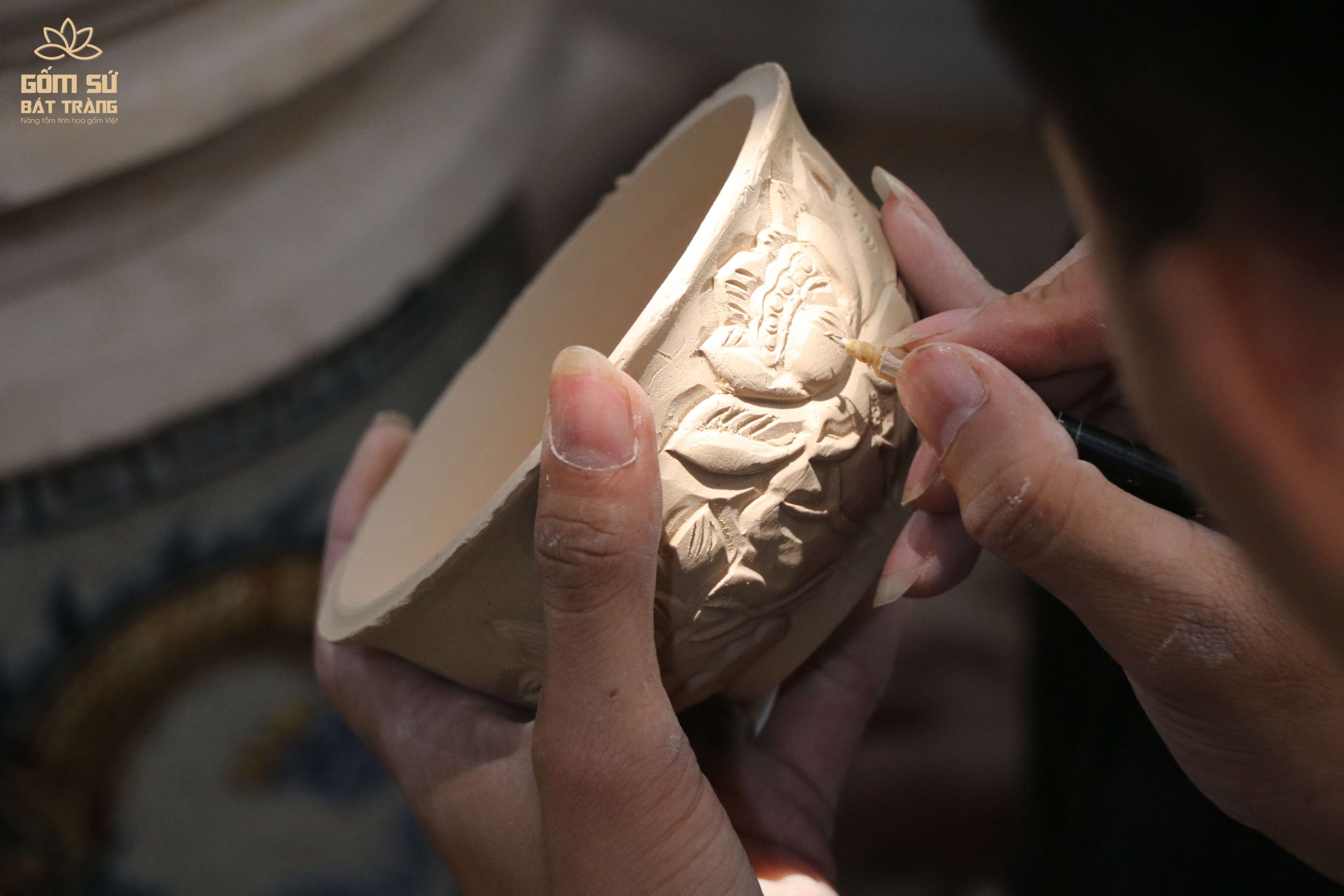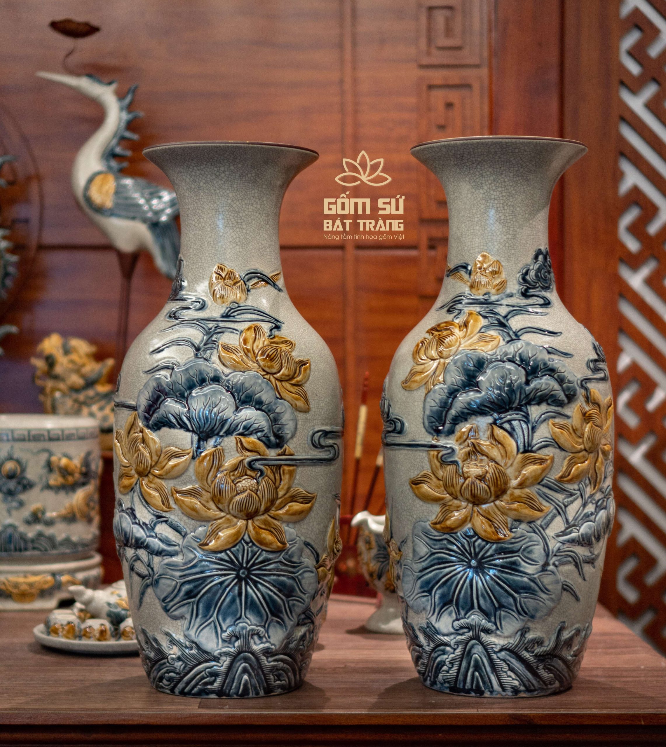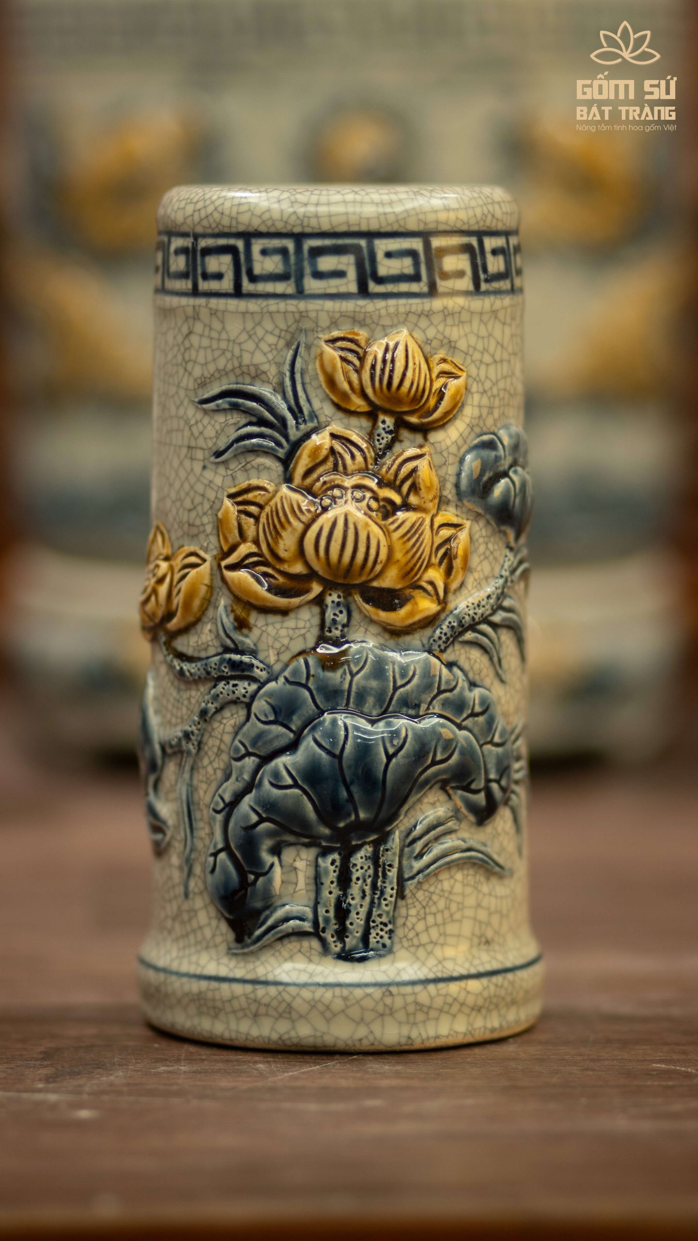 Họa tiết đắp nổi – Đỉnh cao Thiên – Địa – Nhân: Trên nền men rạn là những họa tiết Rồng, Phượng, hoa Sen được thực hiện hoàn toàn thủ công qua các công đoạn: vuốt, tiện, vẽ, đắp nổi, khắc chìm. Mỗi đường nét đều là sự hợp nhất của Thiên (họa tiết trời), Địa (nguyên liệu đất quý) và Nhân (nhiệt tâm của nghệ nhân). Chính sự tỉ mỉ trong từng vảy rồng, cánh sen đã tạo nên hiệu ứng thị giác sống động, giúp không gian thờ tự trở nên uy nghi và đầy “thần khí”.