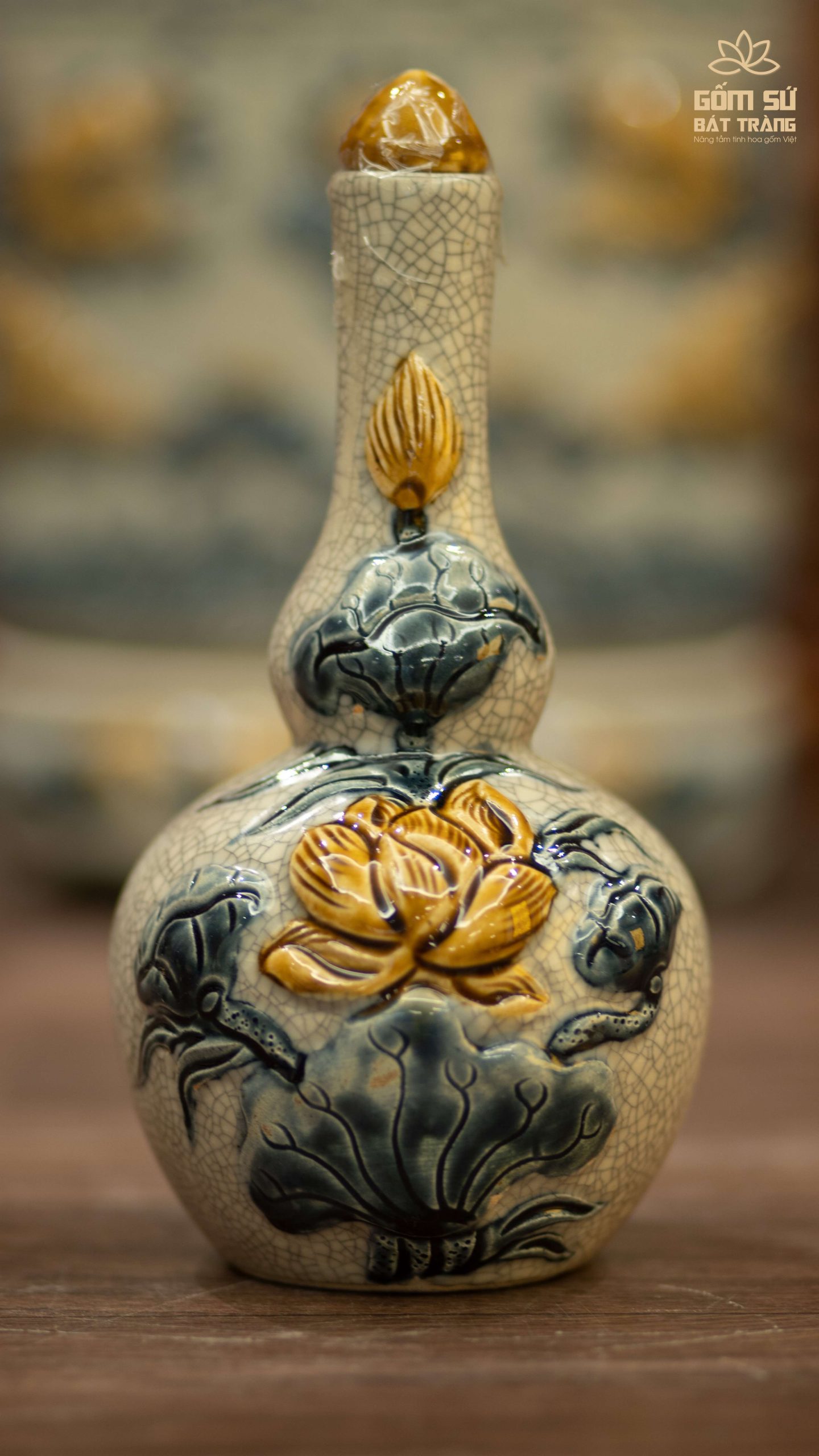 Với miệng loe hút vượng khí, cổ thắt giữ tài lộc và bụng phình chứa đựng phúc đức, tiểu lộc bình là bảo vật bảo tồn khí lành cho dòng tộc. Những đóa sen gỗ không bao giờ héo úa đi cùng dáng bình gốm là minh chứng cho lòng hiếu thảo trường cửu, bền bỉ theo năm tháng.